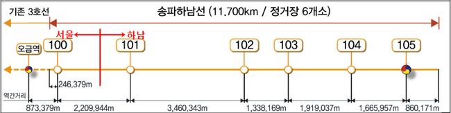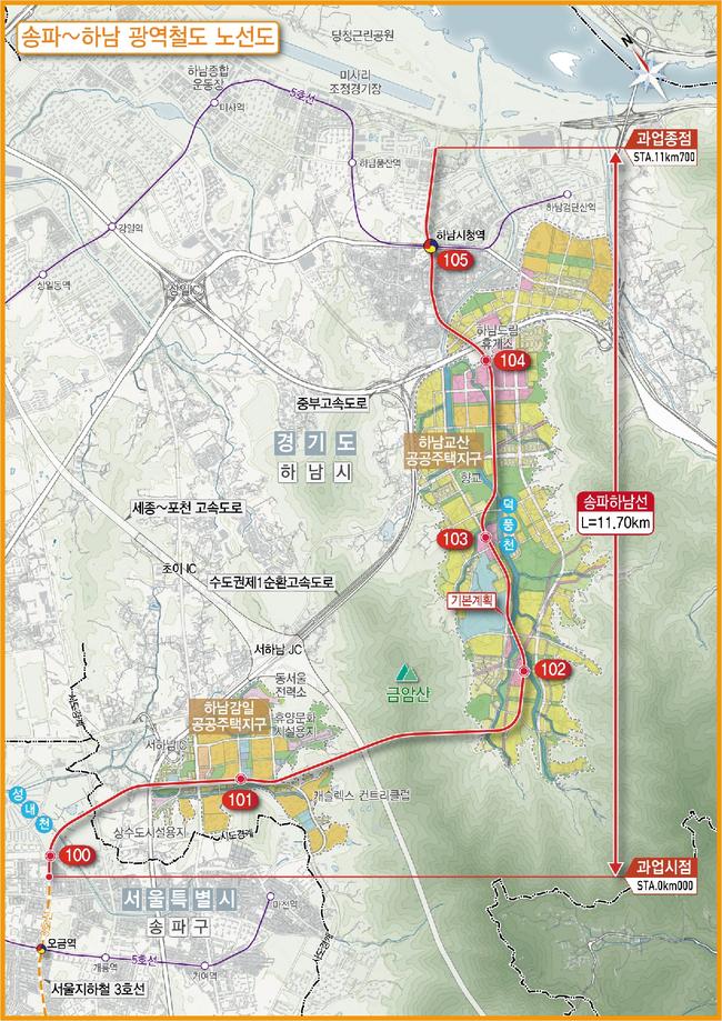송파하남선(서울3호선 연장) 광역철도 노선도 송파하남선은 서울시와 경기도, 하남시가 공동 시행하며, 송파구 방이동 1곳과 하남시 감일·교산 등 5곳에 정거장이 건설된다.