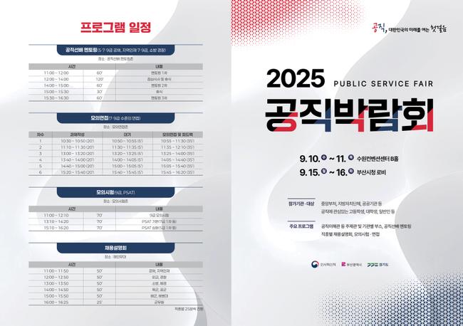 공직 채용정보 한눈에… ‘2025 공직박람회’ 개막 - 72개 기관 참여, 수원 10~11일·부산 15~16일 개최 - 공무원 시험 모의체험·멘토링·채용설명회 등 다채로운 프로그램 마련 - 경찰 체력검정 체험·지역 산하기관 참여로 현장감 강화