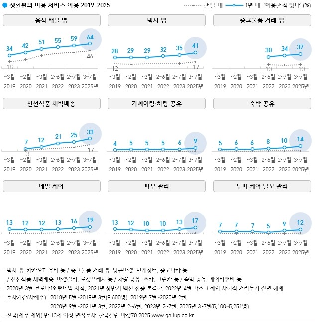 한국갤럽은 올해 3월부터 7월까지 전국(제주 제외) 만 13세 이상 5,251명을 대상으로 금융·쇼핑·생활편의·미용 관련 서비스 19종의 이용 경험을 조사한 결과를 발표했다.