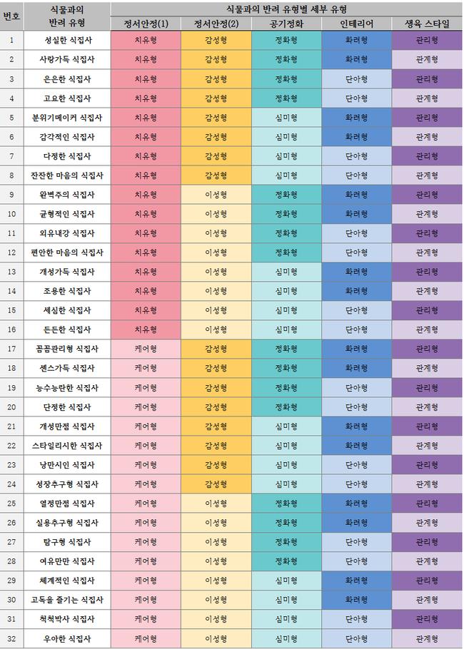 이번에 공개된 서비스는 엠비티아이(MBTI) 성격유형검사 방식과 유사하게 8가지 문항에 대한 이용자 응답을 바탕으로 성향을 분석한다. 응답 결과는 총 32가지 ‘반려 유형’으로 분류되며, 각 유형에 맞춰 228종의 반려식물 가운데 적합한 식물을 추천하고 식물별 생육·관리 정보를 함께 제공한다.
