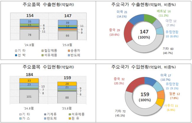 8월 초 수출 4.3% 감소·수입 13.6% 감소…무역수지 12억 달러 적자 - 반도체·선박 수출 증가했으나 석유제품·무선통신기기 감소 - 에너지 수입액 17.7% 줄며 전반적 수입 감소세