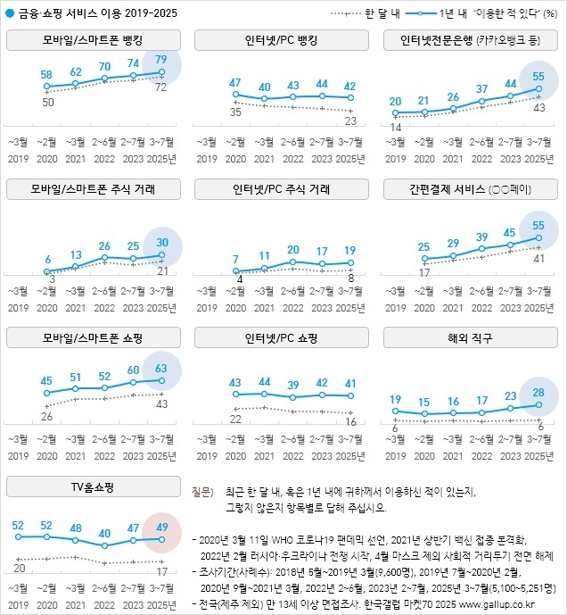 모바일 뱅킹·간편결제 대세…새벽배송·중고거래도 일상화 - 한국갤럽 ‘마켓70 2025’ 조사, 금융·쇼핑·생활편의·미용 서비스 19종 이용률 공개 - 모바일 기반 서비스 확산, PC 뱅킹·쇼핑은 정체·감소세 뚜렷 - 새벽배송·중고거래 앱 급성장, 미용 관리 서비스도 팬데믹 이전 수준 넘어