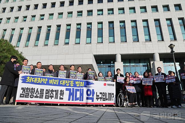 국민의힘은 11일 서울 서초구 대검찰청과 경기 과천시 법무부 청사 앞에서 장동혁 당 대표, 송언석 원내대표 등 소속 의원들이 참석한 가운데 검찰의 대장동 사건 항소 포기와 관련한 외압 의혹을 제기하며 정성호 법무부 장관의 사퇴와 국정조사·특검을 요구하는 규탄대회를 열었다.