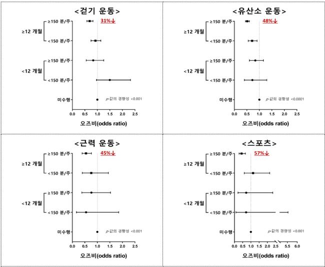 분석 결과 운동을 전혀 하지 않는 집단과 비교해 운동을 수행한 집단의 우울 증상 위험은 전반적으로 유의미하게 낮았다. 위험 감소 폭은 걷기 19%, 유산소 41%, 근력 40%, 스포츠 46%로 나타났다. 특히 운동의 종류와 관계없이 주 150분 이상을 1년 이상 꾸준히 지속했을 때 예방 효과가 가장 컸다.