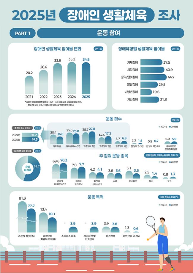 운동하는 장애인일수록 더 행복…생활체육 참여율 34.8% - 장애인 생활체육 참여율 전년 대비 0.4%p 감소…야외 공원 이용 가장 많아 - 생활체육 참여 높을수록 행복도 상승…비용 지원 필요성 가장 커 - 정부, 2026년 반다비 체육센터 등 인프라·비용·프로그램 지원 확대